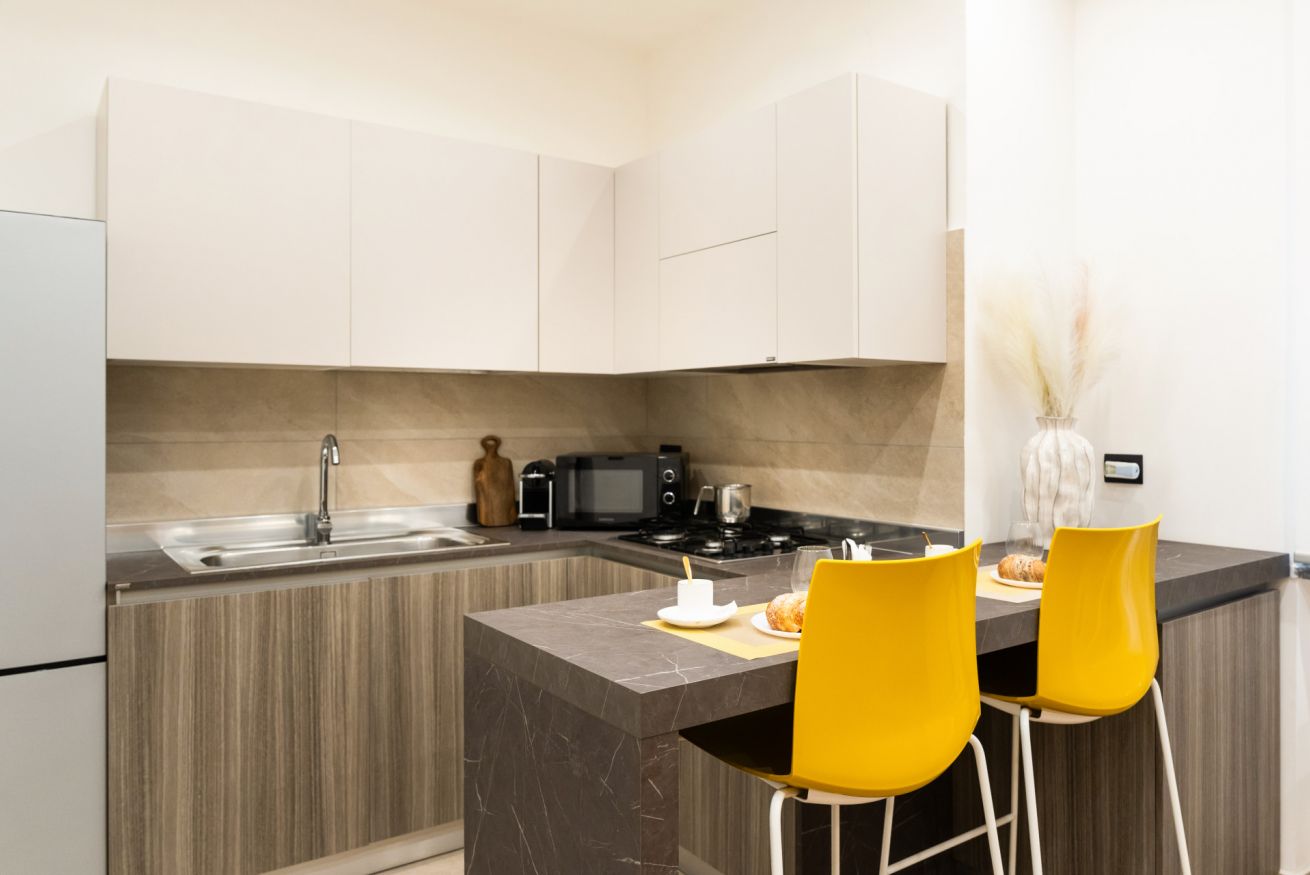 • Cucina minimal dotata di fornelli a gas, macchinetta del caffè, bollitore e pratici pensili